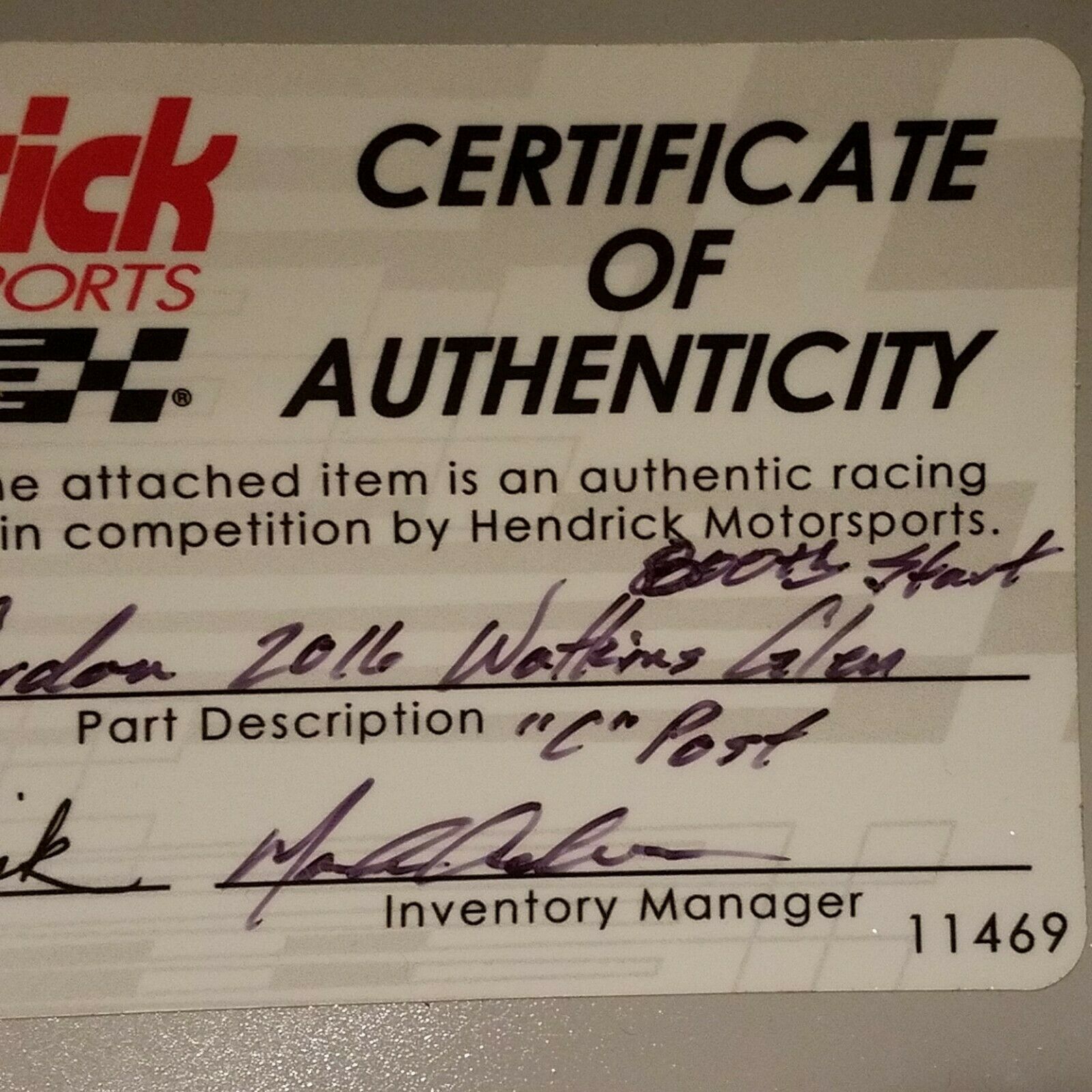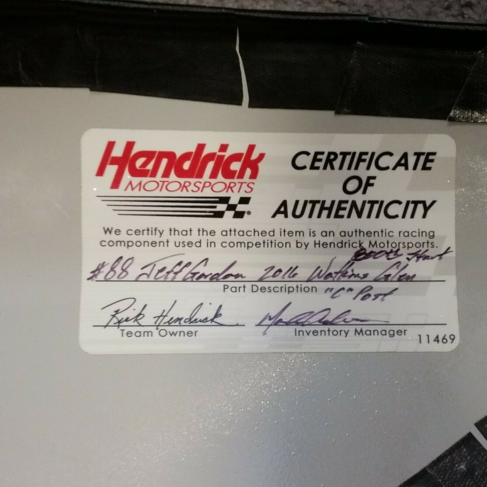 This is amazing piece of NASCAR History. Jeff Gordons 800th Start at Watkins Glen in 2016 when he was subbing for DALE EARNHARDT JR. This is off the 88th car and comes SIGNED by both JEFF GORDON and DALE EARHNARDT JR. Also comes with a COA from Hendrick Motorsports on the back. An amazing piece of NASCAR history. You wont see another like it.
